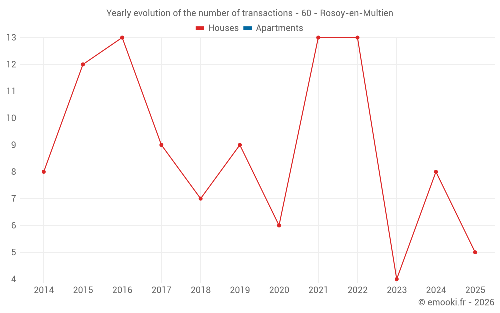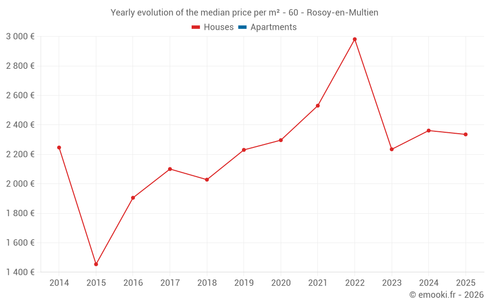 The median price on the 16 house transactions of the last 24 months in the municipality of Rosoy-en-Multien was 2 318 € per square meter for a median property value of 229 400 €. Over this period, 60% of transactions were between 1 520 and 2 714 € per square meter (from the 2nd to the 8th deciles).