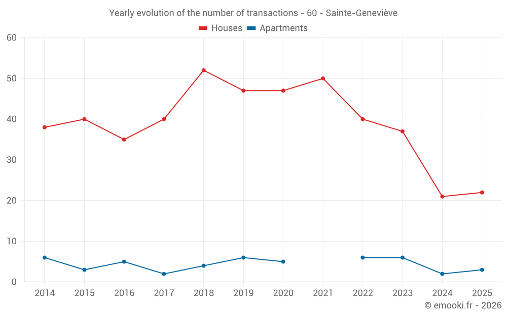 The median price on the 22 house transactions of the last 6 months in the municipality of Sainte-Geneviève was 2 576 € per square meter for a median property value of 223 500 €. Over this period, 60% of transactions were between 2 023 and 3 058 € per square meter (from the 2nd to the 8th deciles).