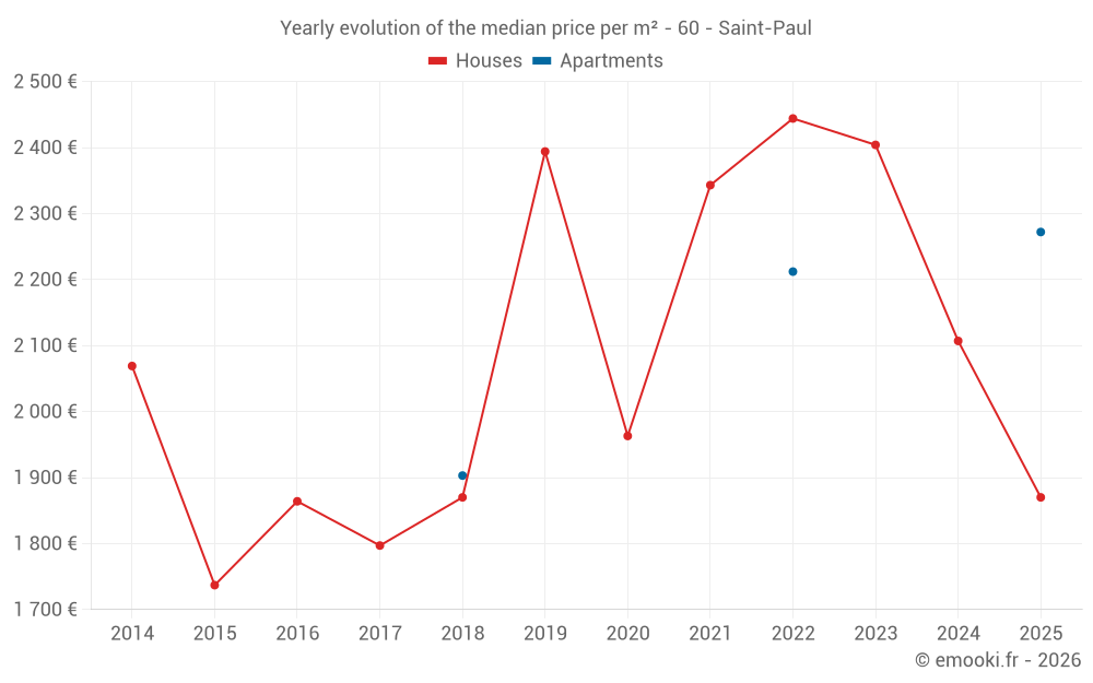 The median price on the 18 house transactions of the last 12 months in the municipality of Saint-Paul was 1 796 € per square meter for a median property value of 233 000 €. Over this period, 60% of transactions were between 1 371 and 2 337 € per square meter (from the 2nd to the 8th deciles).
