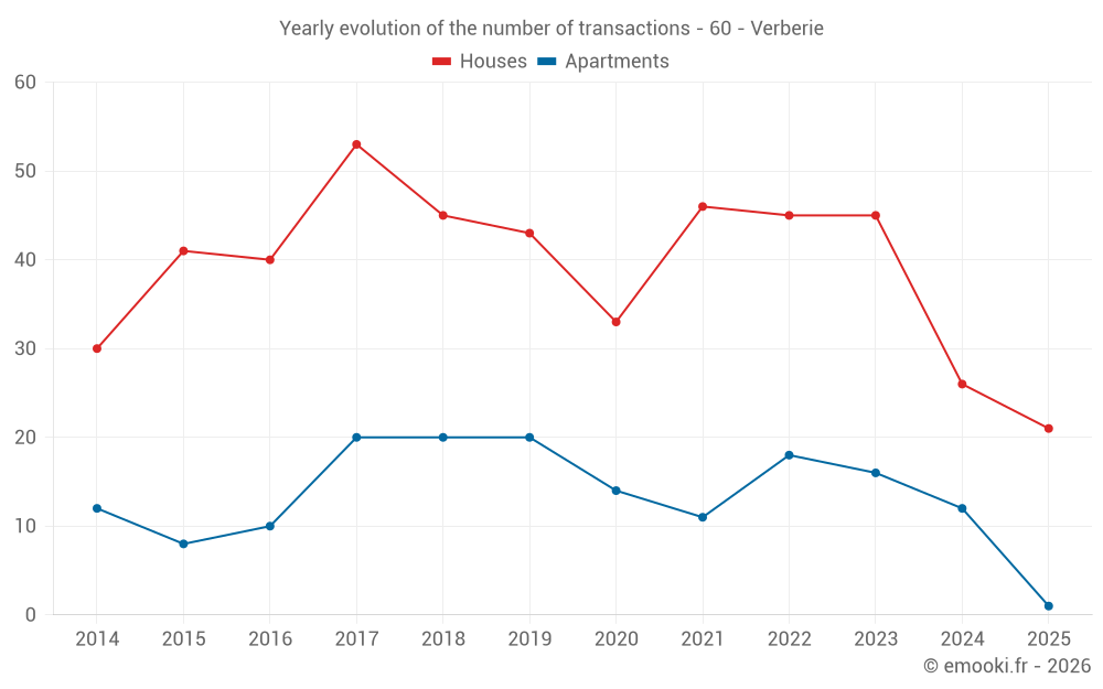The median price on the 21 house transactions of the last 6 months in the municipality of Verberie was 2 216 € per square meter for a median property value of 176 000 €. Over this period, 60% of transactions were between 1 892 and 2 747 € per square meter (from the 2nd to the 8th deciles).