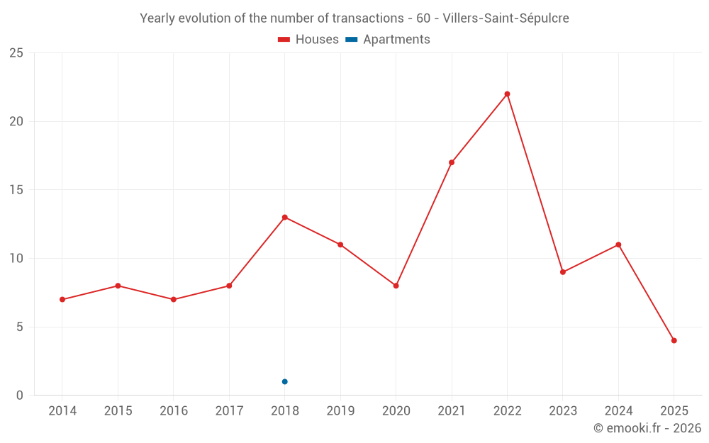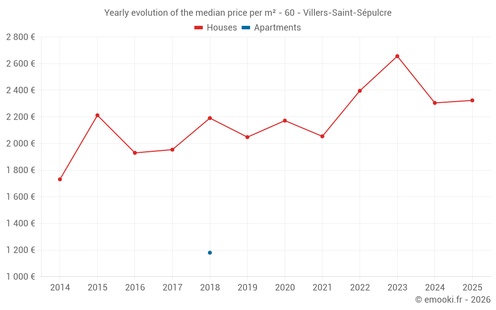 The median price on the 19 house transactions of the last 24 months in the municipality of Villers-Saint-Sépulcre was 2 305 € per square meter for a median property value of 196 000 €. Over this period, 60% of transactions were between 1 861 and 2 701 € per square meter (from the 2nd to the 8th deciles).