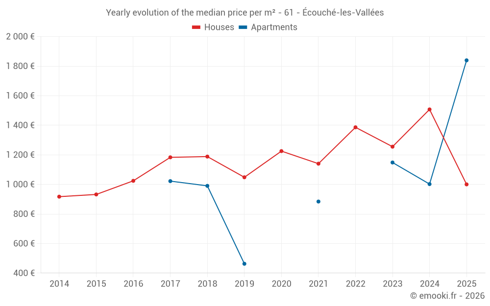 The median price on the 19 house transactions of the last 12 months in the municipality of Écouché-les-Vallées was 1 486 € per square meter for a median property value of 124 000 €. Over this period, 60% of transactions were between 741 and 1 790 € per square meter (from the 2nd to the 8th deciles).