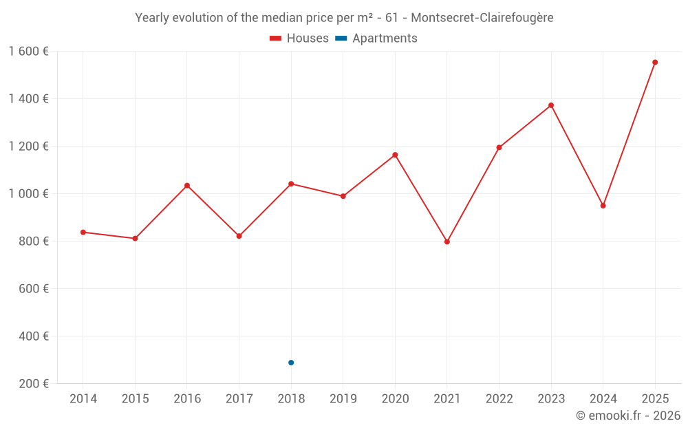 The median price on the 16 house transactions of the last 24 months in the municipality of Montsecret-Clairefougère was 1 276 € per square meter for a median property value of 75 295 €. Over this period, 60% of transactions were between 769 and 1 557 € per square meter (from the 2nd to the 8th deciles).