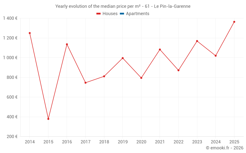 The median price on the 19 house transactions of the last 24 months in the municipality of Le Pin-la-Garenne was 1 169 € per square meter for a median property value of 113 000 €. Over this period, 60% of transactions were between 640 and 1 816 € per square meter (from the 2nd to the 8th deciles).