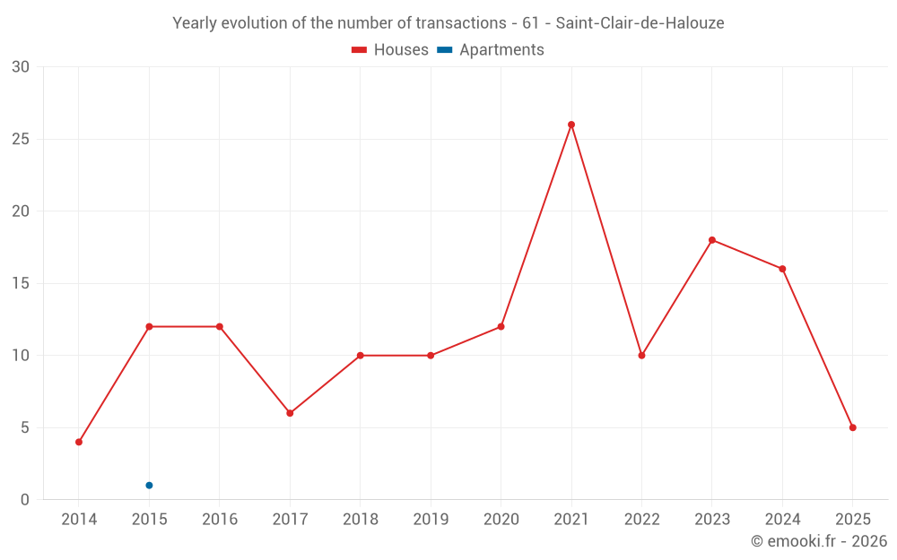 The median price on the 28 house transactions of the last 24 months in the municipality of Saint-Clair-de-Halouze was 936 € per square meter for a median property value of 79 250 €. Over this period, 60% of transactions were between 727 and 1 515 € per square meter (from the 2nd to the 8th deciles).