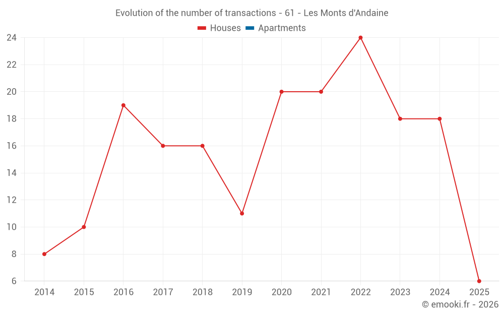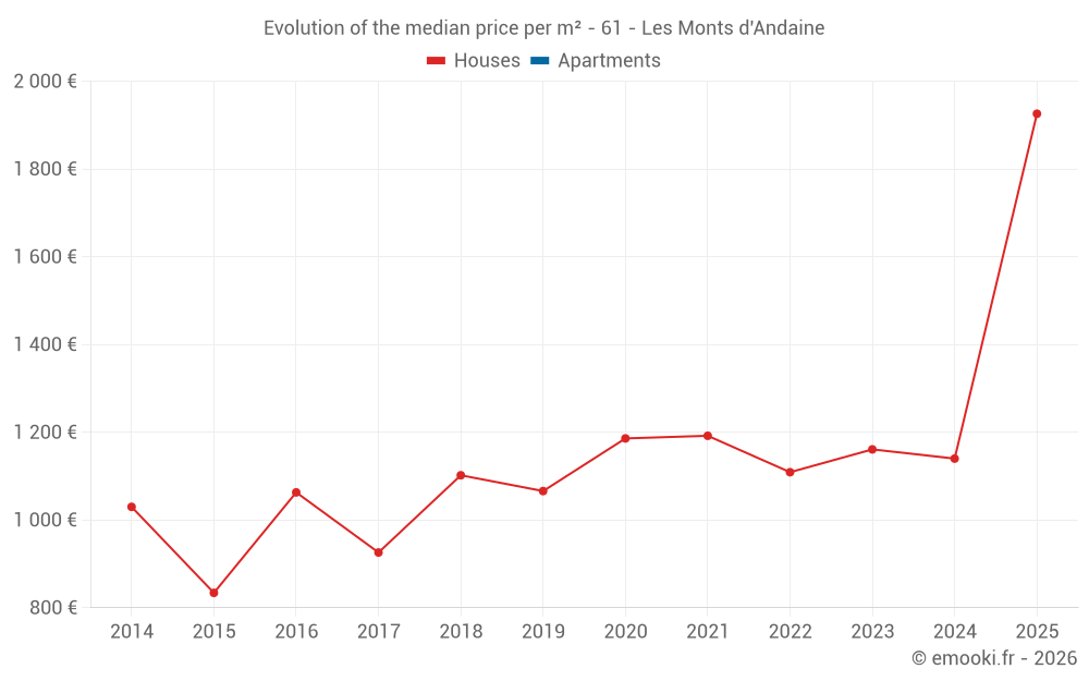 The median price on the 32 house transactions of the last 24 months in the municipality of Les Monts d'Andaine was 1 140 € per square meter for a median property value of 101 350 €. Over this period, 60% of transactions were between 560 and 2 005 € per square meter (from the 2nd to the 8th deciles).