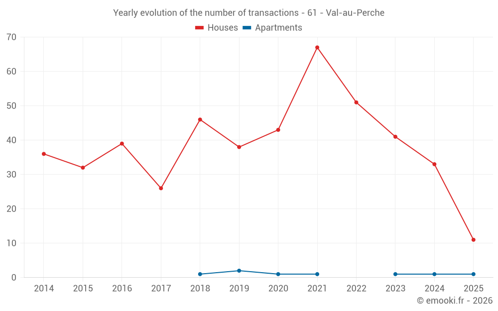 The median price on the 31 house transactions of the last 12 months in the municipality of Val-au-Perche was 1 593 € per square meter for a median property value of 129 000 €. Over this period, 60% of transactions were between 915 and 1 842 € per square meter (from the 2nd to the 8th deciles).