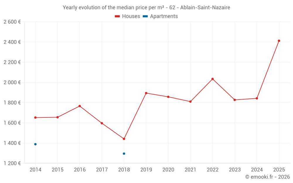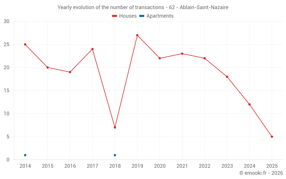 The median price on the 28 house transactions of the last 24 months in the municipality of Ablain-Saint-Nazaire was 1 969 € per square meter for a median property value of 182 500 €. Over this period, 60% of transactions were between 1 385 and 2 577 € per square meter (from the 2nd to the 8th deciles).