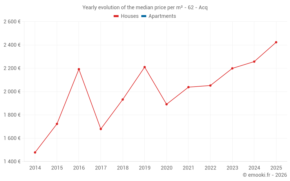 The median price on the 21 house transactions of the last 24 months in the municipality of Acq was 2 257 € per square meter for a median property value of 250 000 €. Over this period, 60% of transactions were between 1 540 and 2 620 € per square meter (from the 2nd to the 8th deciles).