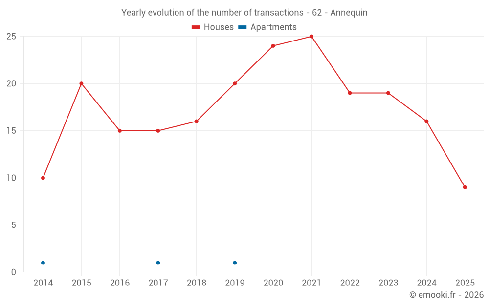 The median price on the 21 house transactions of the last 12 months in the municipality of Annequin was 1 509 € per square meter for a median property value of 149 000 €. Over this period, 60% of transactions were between 1 219 and 2 200 € per square meter (from the 2nd to the 8th deciles).