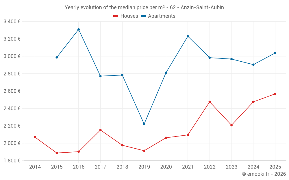 The median price on the 29 house transactions of the last 12 months in the municipality of Anzin-Saint-Aubin was 2 568 € per square meter for a median property value of 314 000 €. Over this period, 60% of transactions were between 1 869 and 2 863 € per square meter (from the 2nd to the 8th deciles).