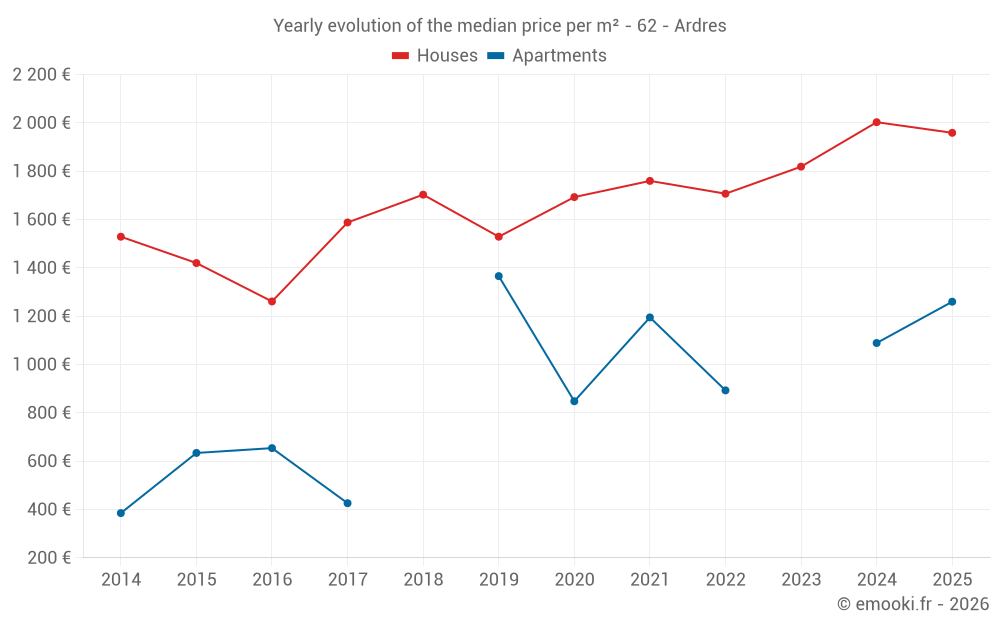 The median price on the 30 house transactions of the last 12 months in the municipality of Ardres was 1 872 € per square meter for a median property value of 230 000 €. Over this period, 60% of transactions were between 1 274 and 2 334 € per square meter (from the 2nd to the 8th deciles).
