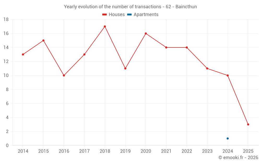 The median price on the 18 house transactions of the last 24 months in the municipality of Baincthun was 2 174 € per square meter for a median property value of 205 000 €. Over this period, 60% of transactions were between 1 731 and 2 624 € per square meter (from the 2nd to the 8th deciles).