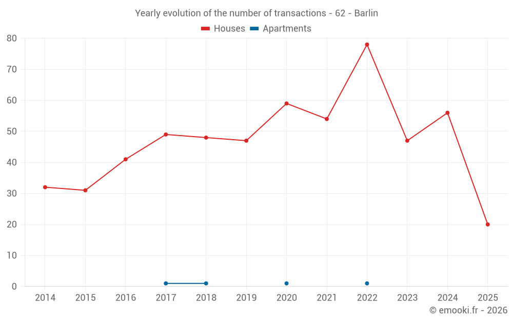 The median price on the 20 house transactions of the last 6 months in the municipality of Barlin was 1 190 € per square meter for a median property value of 97 500 €. Over this period, 60% of transactions were between 915 and 1 597 € per square meter (from the 2nd to the 8th deciles).