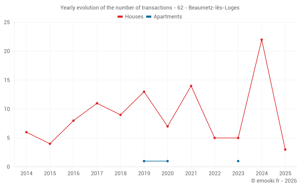 The median price on the 26 house transactions of the last 24 months in the municipality of Beaumetz-lès-Loges was 2 025 € per square meter for a median property value of 168 000 €. Over this period, 60% of transactions were between 1 807 and 2 060 € per square meter (from the 2nd to the 8th deciles).