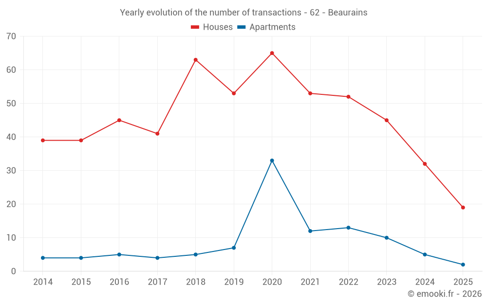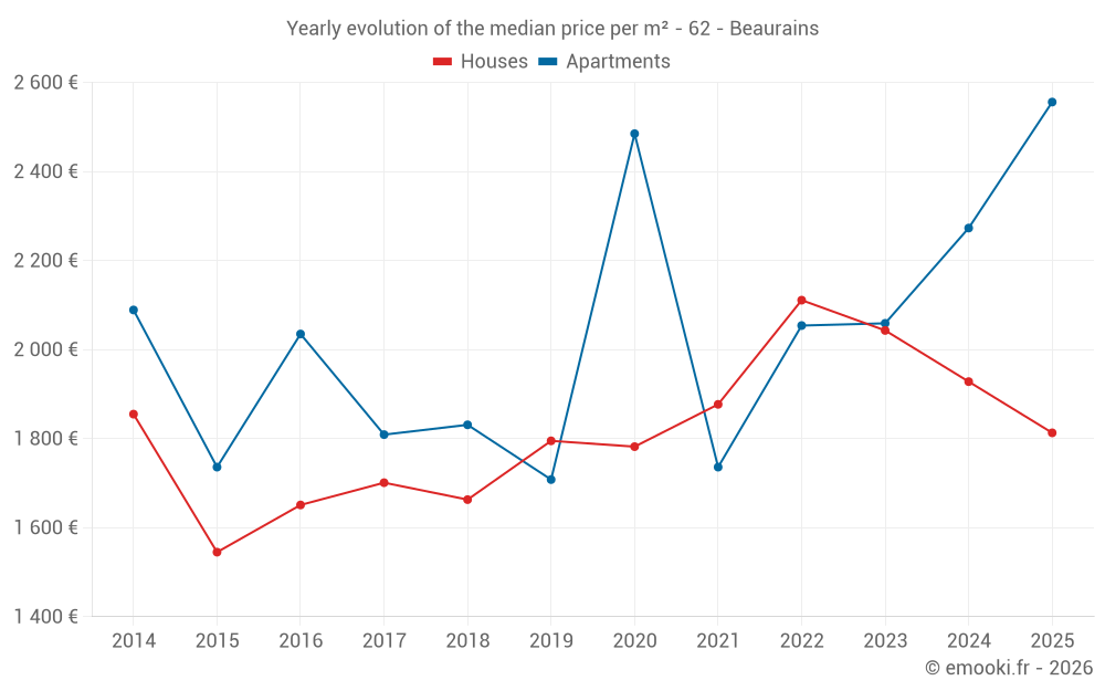 The median price on the 19 house transactions of the last 6 months in the municipality of Beaurains was 1 813 € per square meter for a median property value of 147 000 €. Over this period, 60% of transactions were between 1 546 and 2 173 € per square meter (from the 2nd to the 8th deciles).