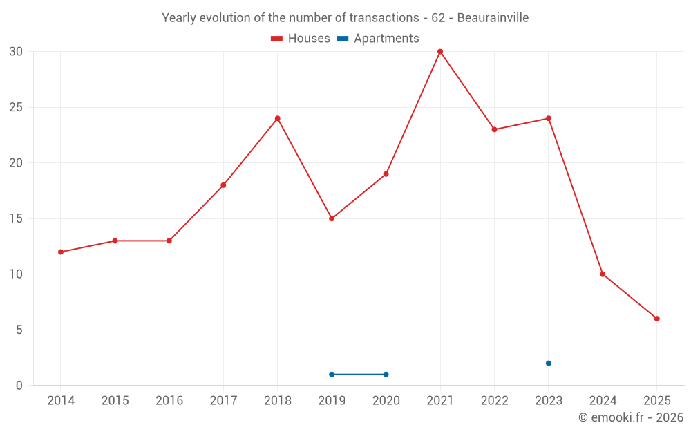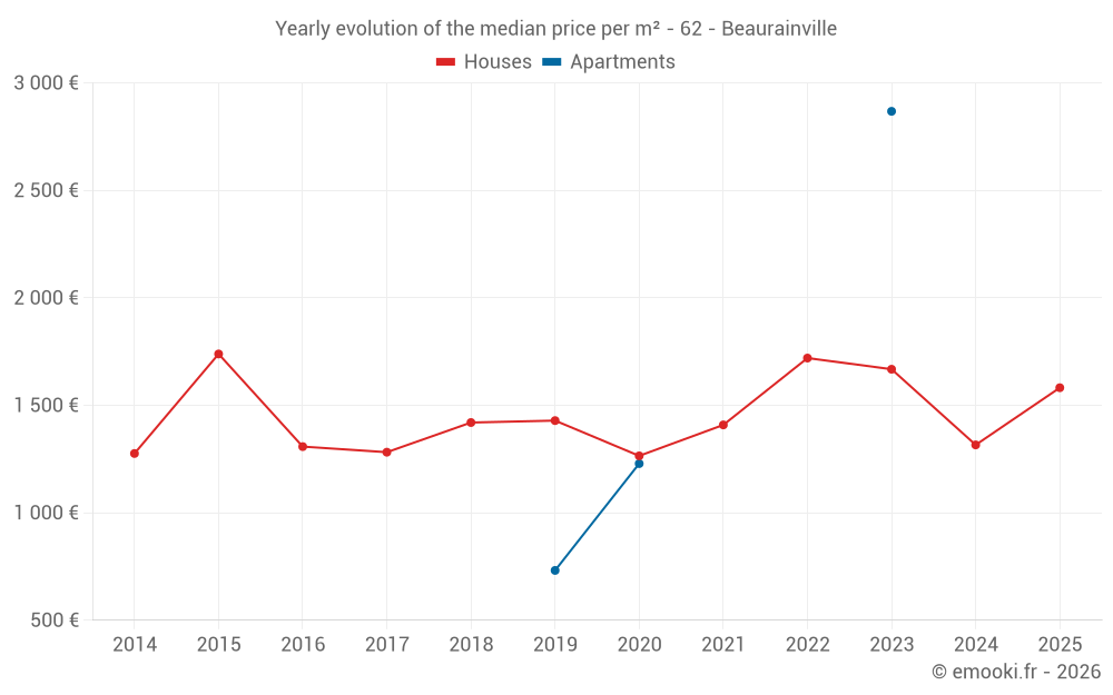 The median price on the 29 house transactions of the last 24 months in the municipality of Beaurainville was 1 774 € per square meter for a median property value of 149 000 €. Over this period, 60% of transactions were between 1 086 and 2 059 € per square meter (from the 2nd to the 8th deciles).