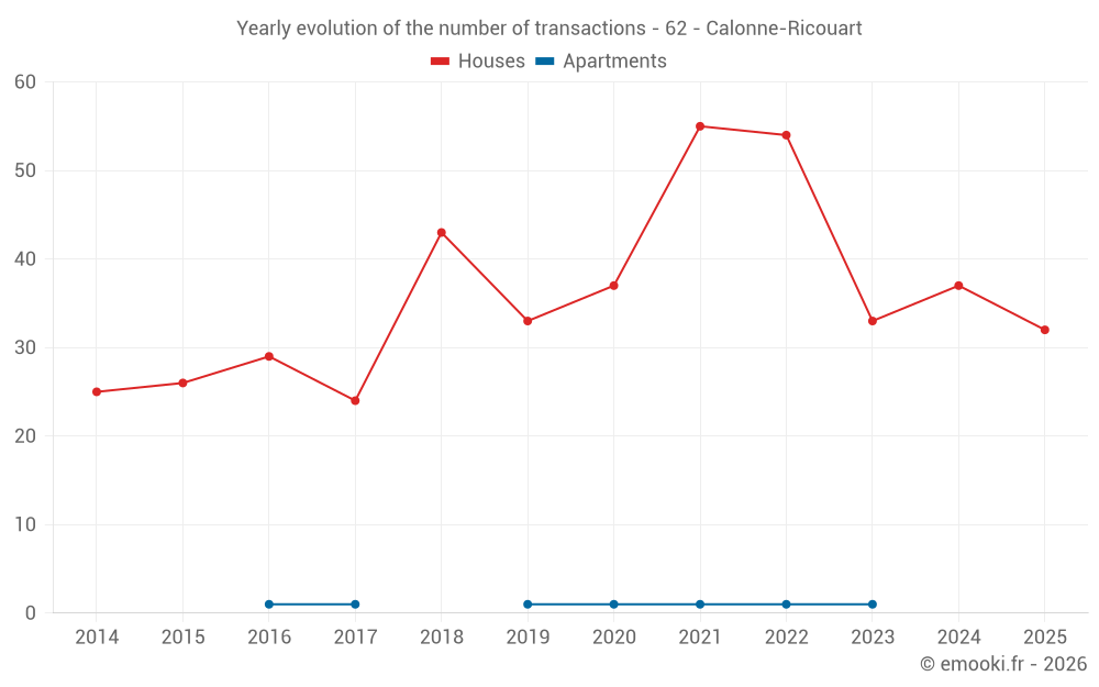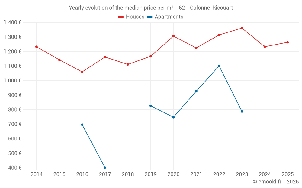 The median price on the 20 house transactions of the last 6 months in the municipality of Calonne-Ricouart was 1 348 € per square meter for a median property value of 90 000 €. Over this period, 60% of transactions were between 830 and 1 822 € per square meter (from the 2nd to the 8th deciles).