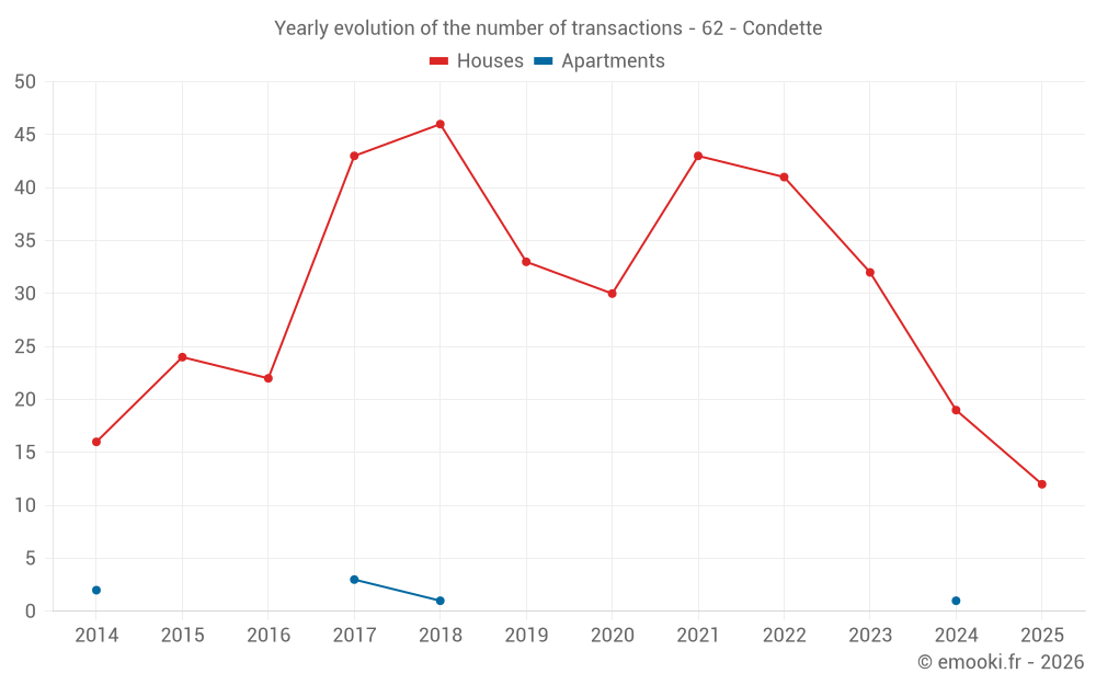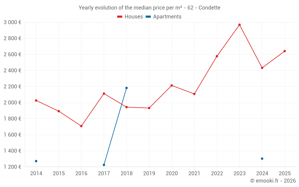 The median price on the 23 house transactions of the last 12 months in the municipality of Condette was 2 586 € per square meter for a median property value of 250 000 €. Over this period, 60% of transactions were between 1 887 and 3 921 € per square meter (from the 2nd to the 8th deciles).