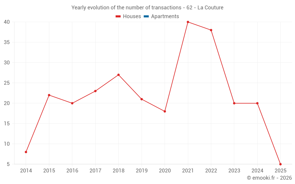 The median price on the 32 house transactions of the last 24 months in the municipality of La Couture was 1 918 € per square meter for a median property value of 207 500 €. Over this period, 60% of transactions were between 1 439 and 2 637 € per square meter (from the 2nd to the 8th deciles).