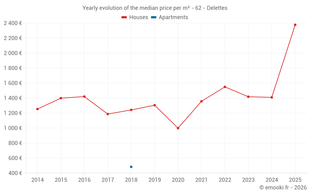 The median price on the 21 house transactions of the last 24 months in the municipality of Delettes was 1 455 € per square meter for a median property value of 160 000 €. Over this period, 60% of transactions were between 1 242 and 2 094 € per square meter (from the 2nd to the 8th deciles).