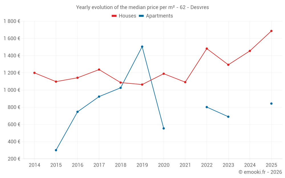 The median price on the 26 house transactions of the last 6 months in the municipality of Desvres was 1 687 € per square meter for a median property value of 135 650 €. Over this period, 60% of transactions were between 1 273 and 1 938 € per square meter (from the 2nd to the 8th deciles).