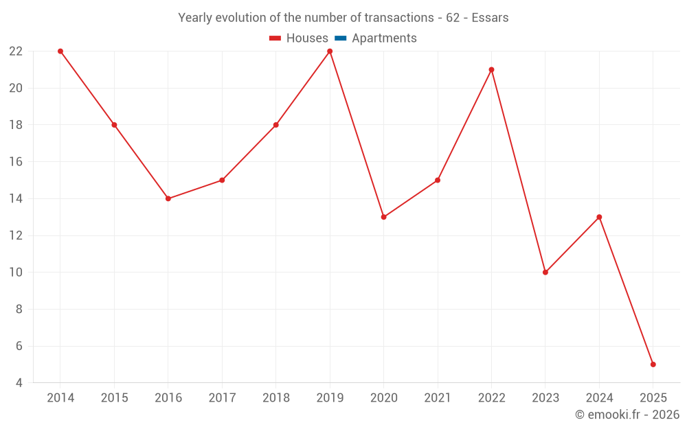 The median price on the 24 house transactions of the last 24 months in the municipality of Essars was 1 724 € per square meter for a median property value of 153 550 €. Over this period, 60% of transactions were between 1 549 and 2 050 € per square meter (from the 2nd to the 8th deciles).
