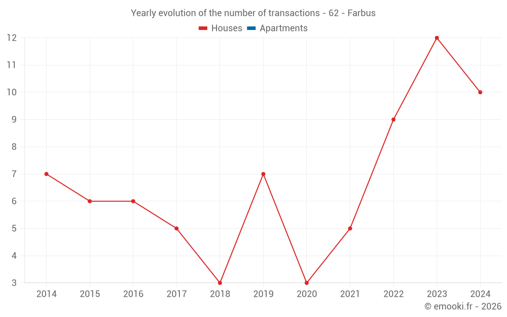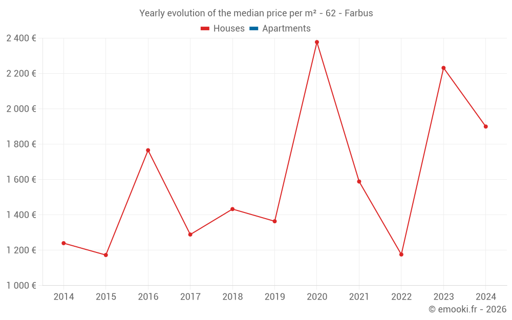 The median price on the 17 house transactions of the last 24 months in the municipality of Farbus was 1 966 € per square meter for a median property value of 220 677 €. Over this period, 60% of transactions were between 1 332 and 2 480 € per square meter (from the 2nd to the 8th deciles).