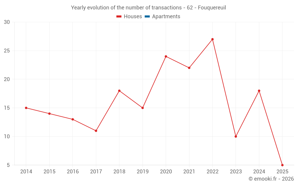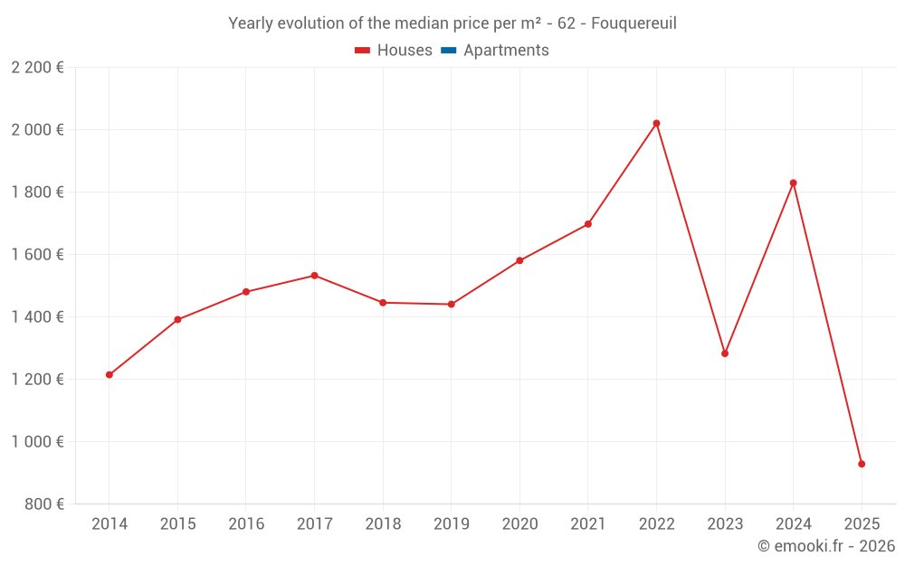 The median price on the 18 house transactions of the last 12 months in the municipality of Fouquereuil was 1 518 € per square meter for a median property value of 152 700 €. Over this period, 60% of transactions were between 973 and 2 384 € per square meter (from the 2nd to the 8th deciles).