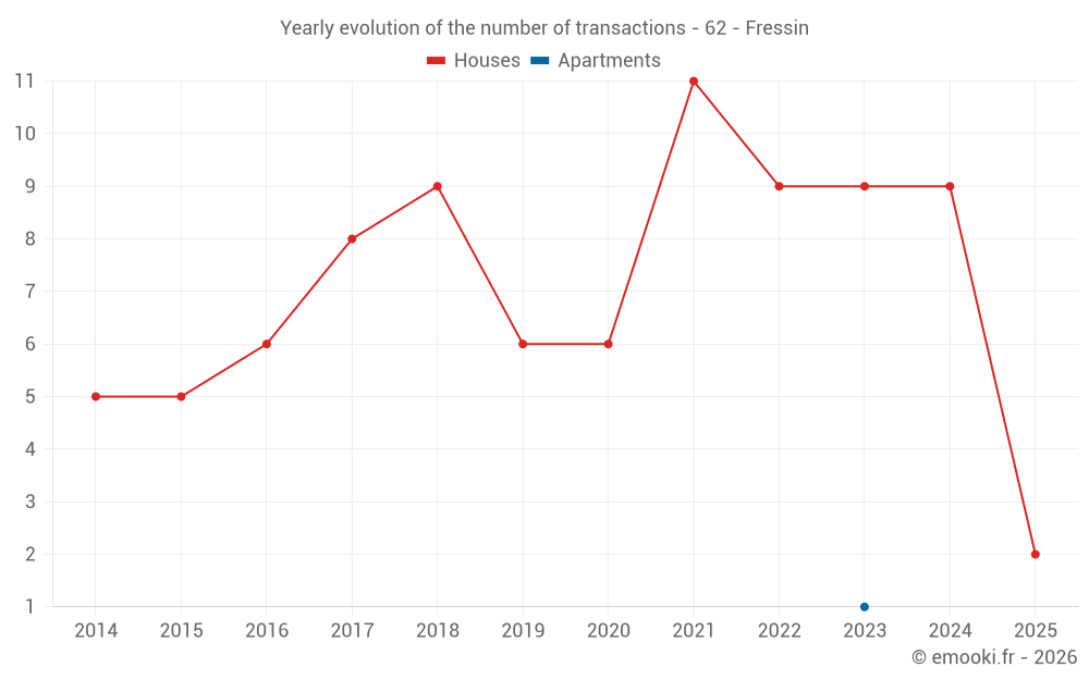The median price on the 15 house transactions of the last 24 months in the municipality of Fressin was 1 609 € per square meter for a median property value of 135 305 €. Over this period, 60% of transactions were between 895 and 2 178 € per square meter (from the 2nd to the 8th deciles).