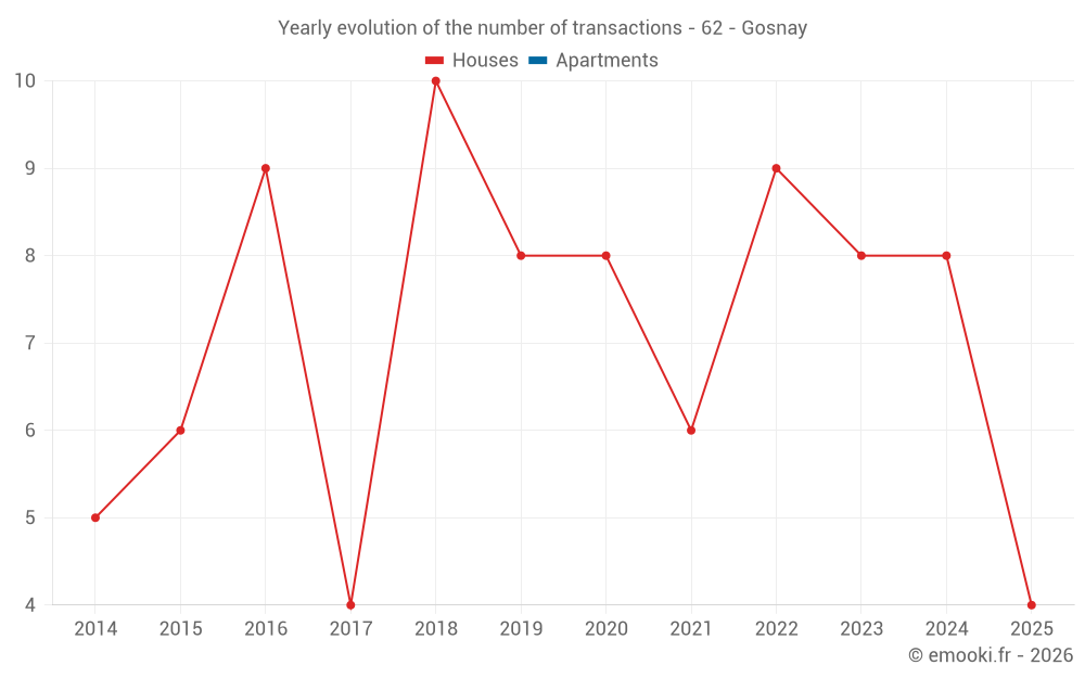 The median price on the 16 house transactions of the last 24 months in the municipality of Gosnay was 1 556 € per square meter for a median property value of 143 825 €. Over this period, 60% of transactions were between 961 and 2 228 € per square meter (from the 2nd to the 8th deciles).