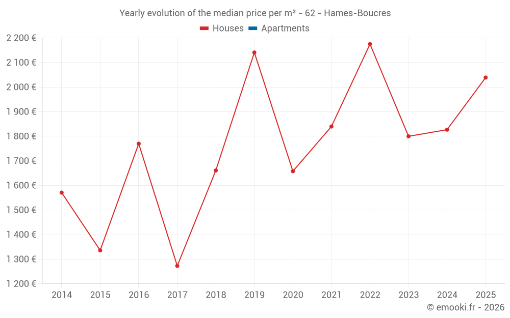 The median price on the 24 house transactions of the last 24 months in the municipality of Hames-Boucres was 1 896 € per square meter for a median property value of 222 100 €. Over this period, 60% of transactions were between 1 532 and 2 299 € per square meter (from the 2nd to the 8th deciles).