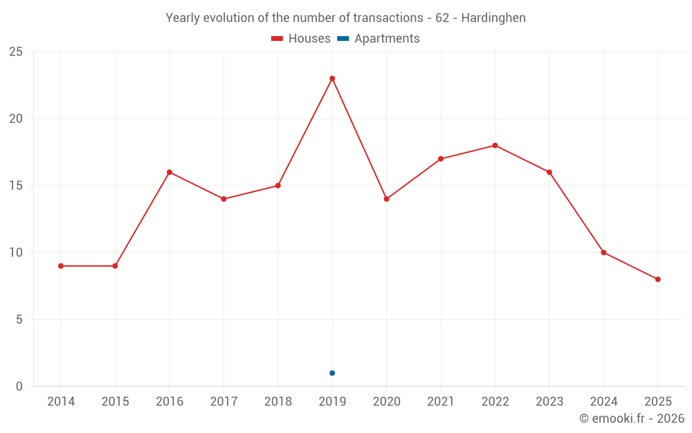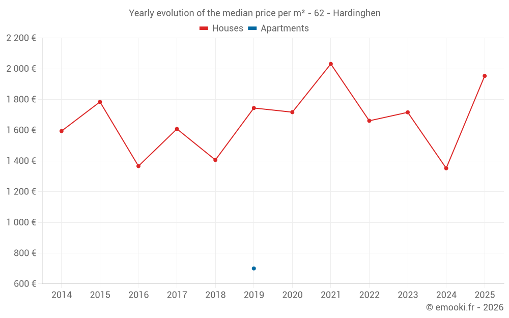 The median price on the 27 house transactions of the last 24 months in the municipality of Hardinghen was 1 575 € per square meter for a median property value of 203 500 €. Over this period, 60% of transactions were between 1 241 and 1 986 € per square meter (from the 2nd to the 8th deciles).
