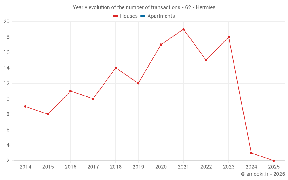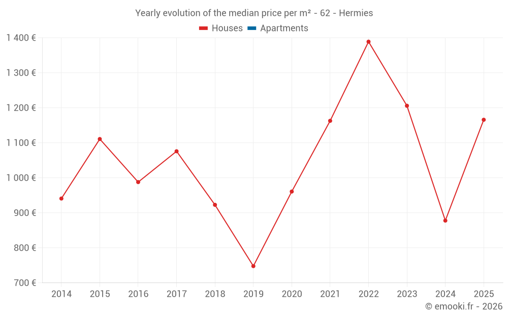 The median price on the 14 house transactions of the last 24 months in the municipality of Hermies was 1 112 € per square meter for a median property value of 96 750 €. Over this period, 60% of transactions were between 740 and 1 293 € per square meter (from the 2nd to the 8th deciles).