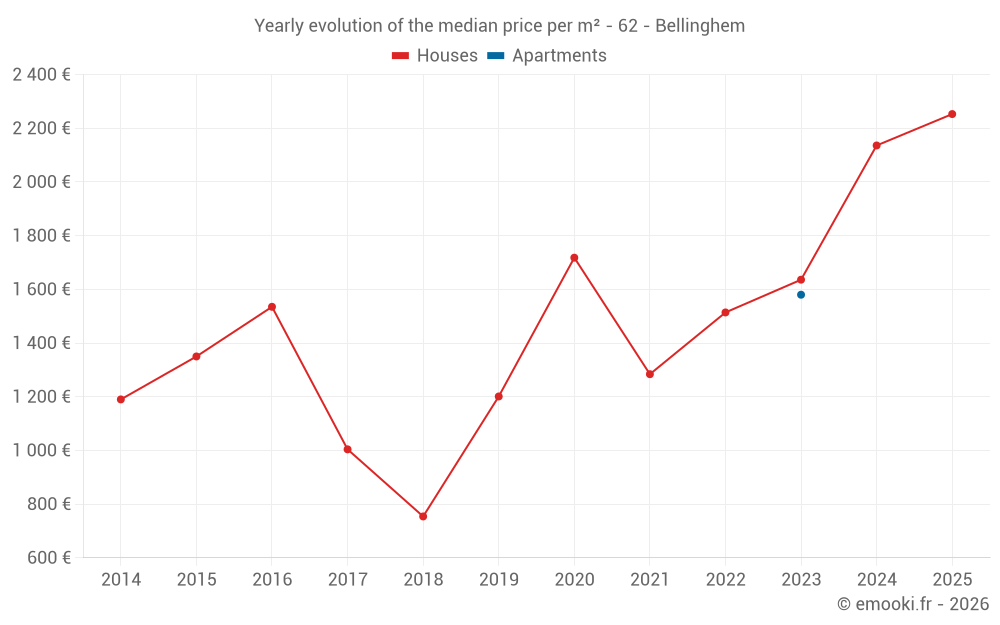 The median price on the 14 house transactions of the last 24 months in the municipality of Bellinghem was 1 760 € per square meter for a median property value of 239 075 €. Over this period, 60% of transactions were between 1 426 and 2 288 € per square meter (from the 2nd to the 8th deciles).