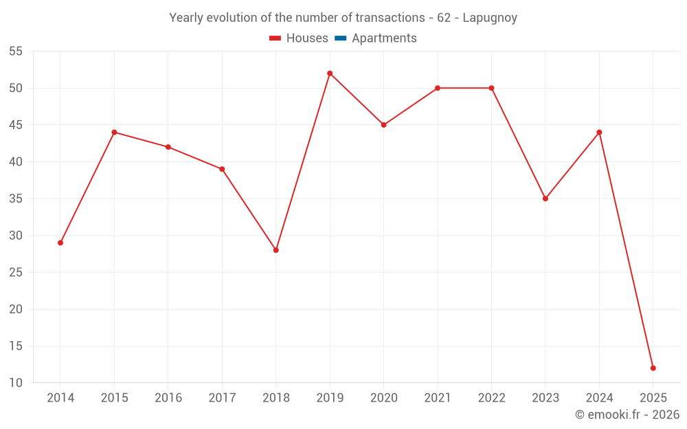 The median price on the 40 house transactions of the last 12 months in the municipality of Lapugnoy was 1 612 € per square meter for a median property value of 145 750 €. Over this period, 60% of transactions were between 785 and 2 029 € per square meter (from the 2nd to the 8th deciles).