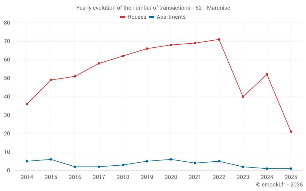 The median price on the 21 house transactions of the last 6 months in the municipality of Marquise was 1 579 € per square meter for a median property value of 150 000 €. Over this period, 60% of transactions were between 1 200 and 2 310 € per square meter (from the 2nd to the 8th deciles).