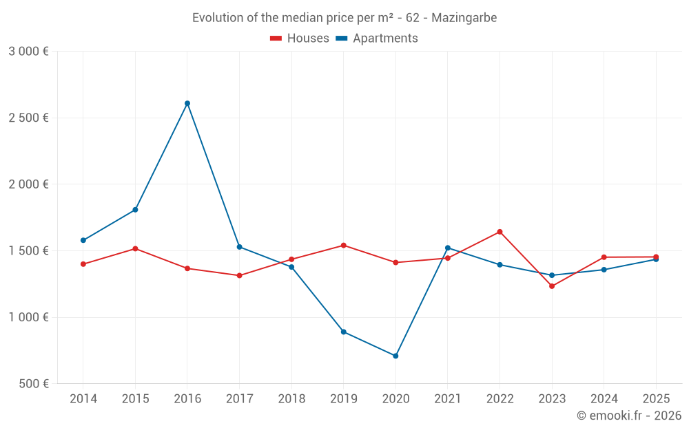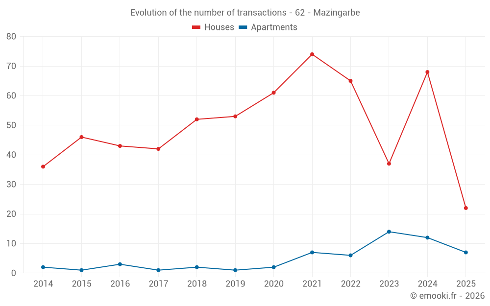 The median price on the 22 house transactions of the last 6 months in the municipality of Mazingarbe was 1 454 € per square meter for a median property value of 133 000 €. Over this period, 60% of transactions were between 1 020 and 1 915 € per square meter (from the 2nd to the 8th deciles).