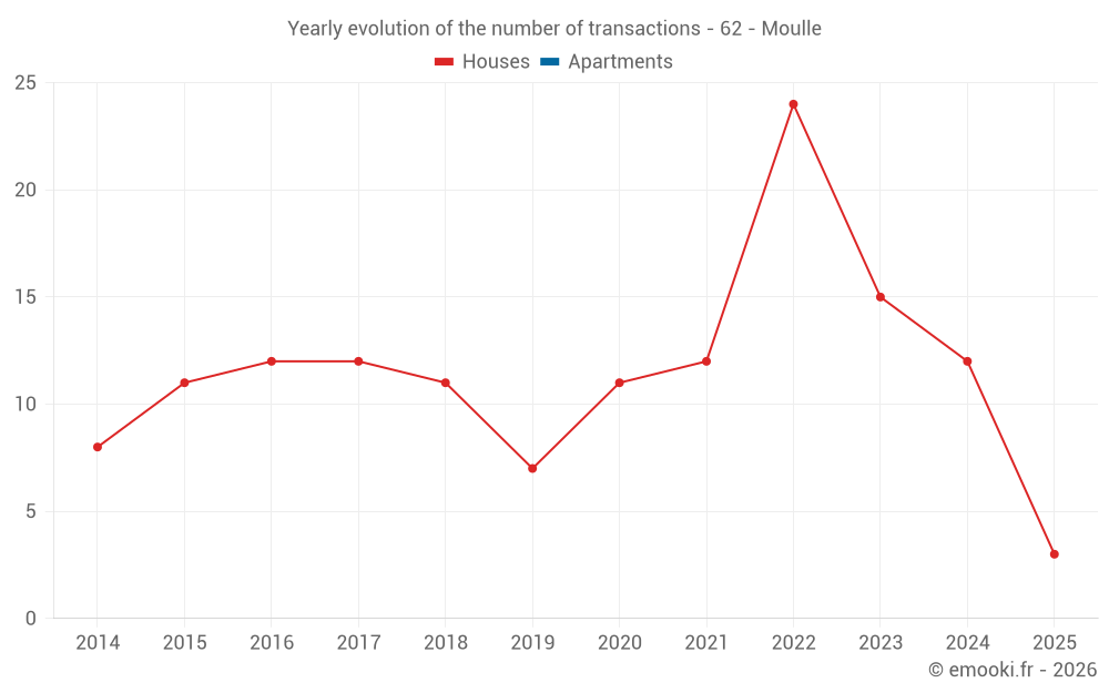 The median price on the 21 house transactions of the last 24 months in the municipality of Moulle was 1 866 € per square meter for a median property value of 218 000 €. Over this period, 60% of transactions were between 1 441 and 2 310 € per square meter (from the 2nd to the 8th deciles).