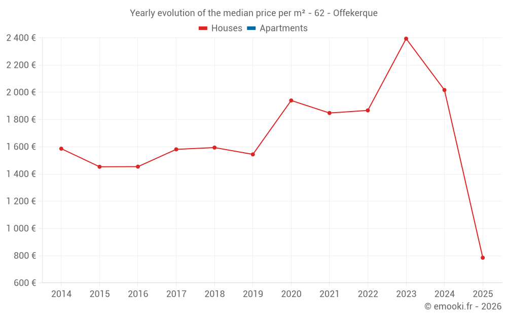The median price on the 24 house transactions of the last 24 months in the municipality of Offekerque was 1 998 € per square meter for a median property value of 240 522 €. Over this period, 60% of transactions were between 1 716 and 2 575 € per square meter (from the 2nd to the 8th deciles).