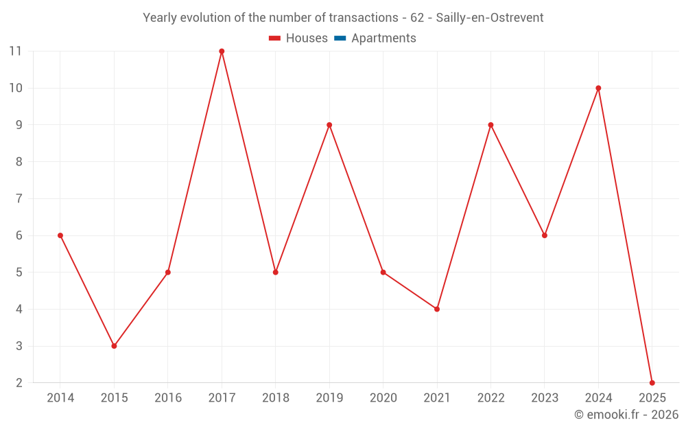 The median price on the 15 house transactions of the last 24 months in the municipality of Sailly-en-Ostrevent was 1 648 € per square meter for a median property value of 171 800 €. Over this period, 60% of transactions were between 1 237 and 1 891 € per square meter (from the 2nd to the 8th deciles).