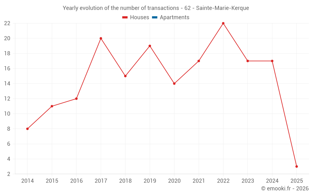 The median price on the 17 house transactions of the last 12 months in the municipality of Sainte-Marie-Kerque was 2 000 € per square meter for a median property value of 196 500 €. Over this period, 60% of transactions were between 1 024 and 2 346 € per square meter (from the 2nd to the 8th deciles).