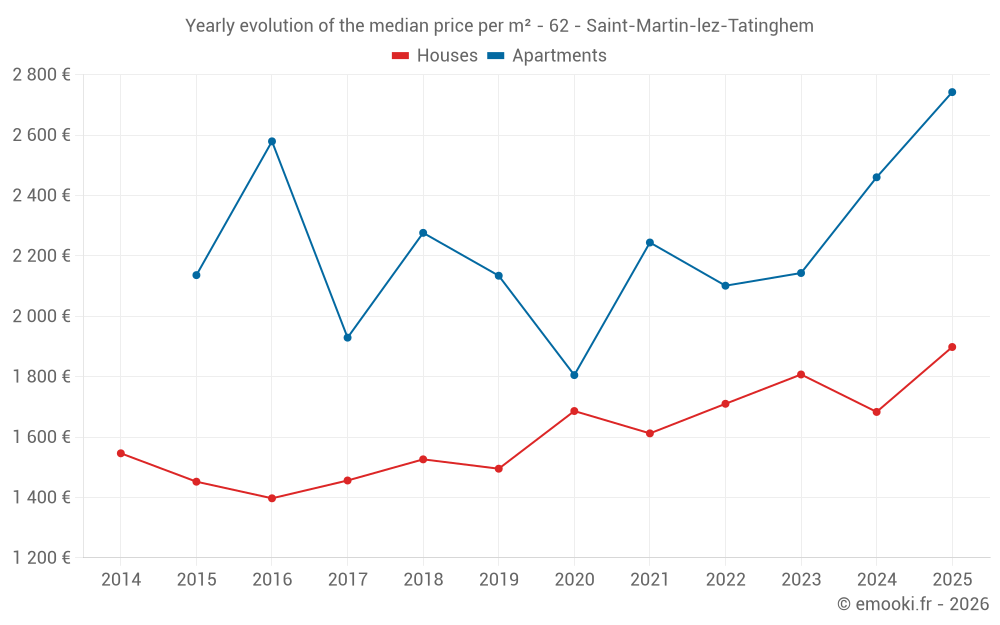 The median price on the 51 house transactions of the last 12 months in the municipality of Saint-Martin-lez-Tatinghem was 1 790 € per square meter for a median property value of 152 850 €. Over this period, 60% of transactions were between 1 412 and 2 168 € per square meter (from the 2nd to the 8th deciles).