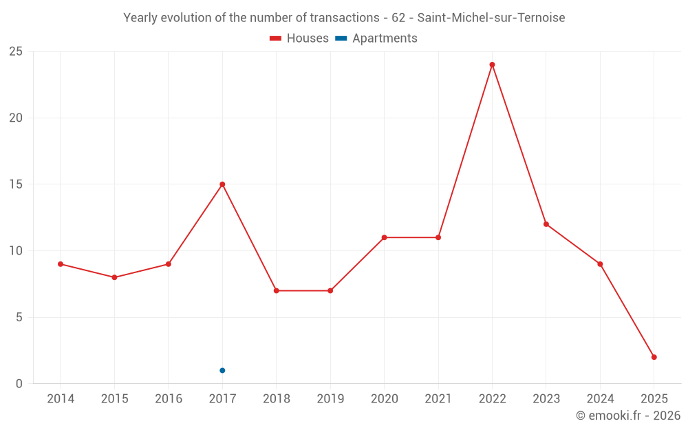 The median price on the 16 house transactions of the last 24 months in the municipality of Saint-Michel-sur-Ternoise was 1 132 € per square meter for a median property value of 103 350 €. Over this period, 60% of transactions were between 710 and 1 260 € per square meter (from the 2nd to the 8th deciles).