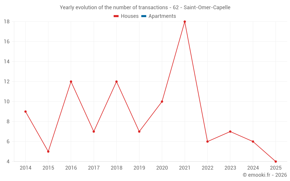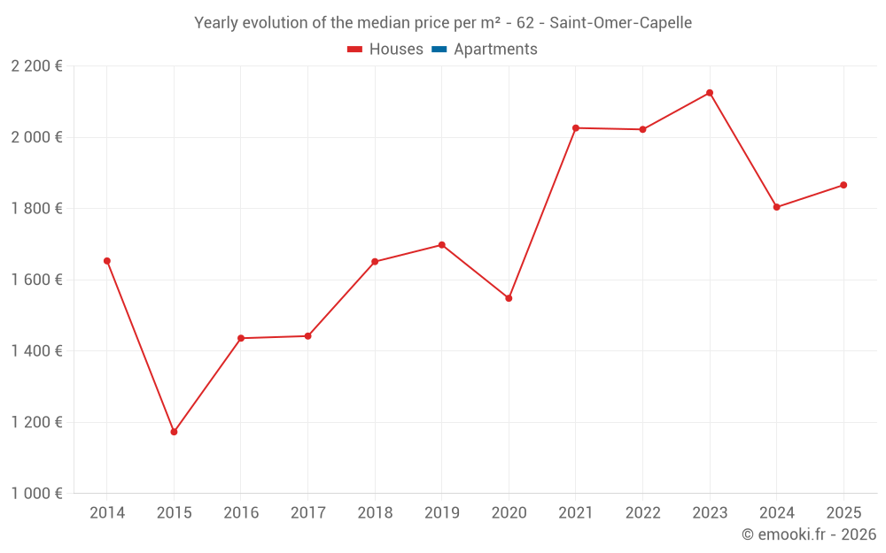 The median price on the 14 house transactions of the last 24 months in the municipality of Saint-Omer-Capelle was 1 956 € per square meter for a median property value of 198 500 €. Over this period, 60% of transactions were between 1 609 and 2 199 € per square meter (from the 2nd to the 8th deciles).