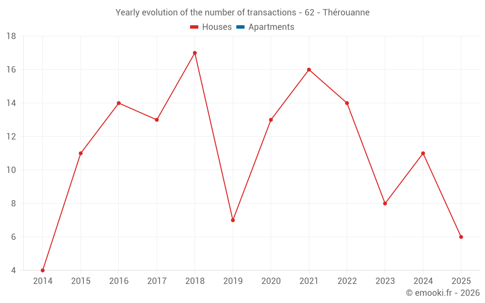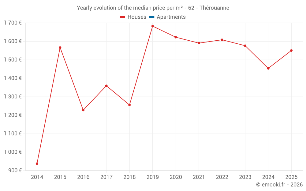The median price on the 23 house transactions of the last 24 months in the municipality of Thérouanne was 1 540 € per square meter for a median property value of 165 000 €. Over this period, 60% of transactions were between 950 and 2 210 € per square meter (from the 2nd to the 8th deciles).