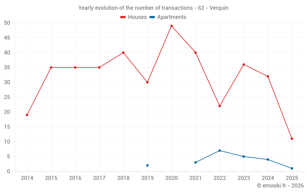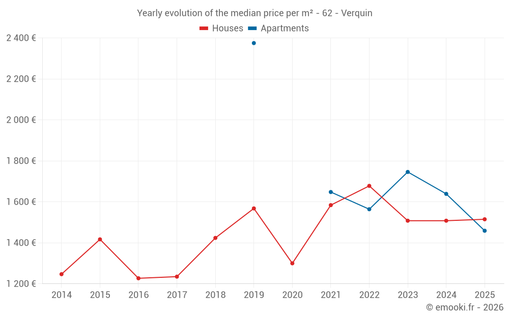 The median price on the 26 house transactions of the last 12 months in the municipality of Verquin was 1 488 € per square meter for a median property value of 143 938 €. Over this period, 60% of transactions were between 1 199 and 1 776 € per square meter (from the 2nd to the 8th deciles).
