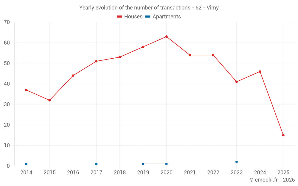 The median price on the 39 house transactions of the last 12 months in the municipality of Vimy was 1 968 € per square meter for a median property value of 170 000 €. Over this period, 60% of transactions were between 1 427 and 2 402 € per square meter (from the 2nd to the 8th deciles).