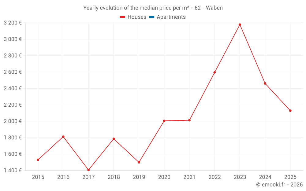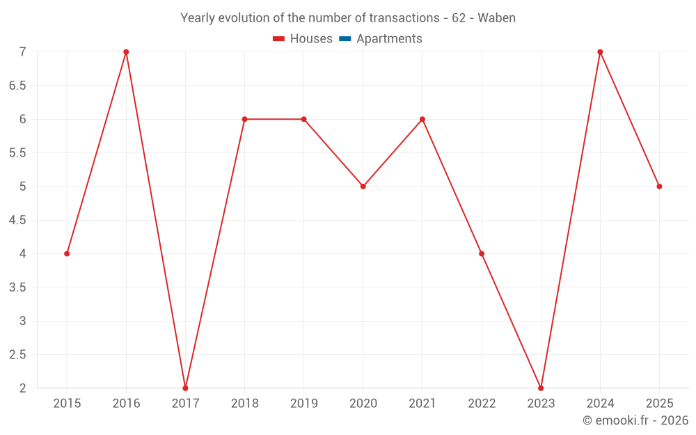 The median price on the 14 house transactions of the last 24 months in the municipality of Waben was 2 427 € per square meter for a median property value of 287 575 €. Over this period, 60% of transactions were between 1 999 and 2 901 € per square meter (from the 2nd to the 8th deciles).