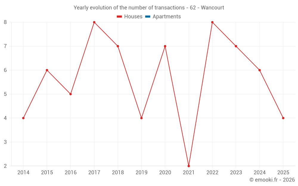 The median price on the 14 house transactions of the last 24 months in the municipality of Wancourt was 2 242 € per square meter for a median property value of 229 482 €. Over this period, 60% of transactions were between 1 394 and 2 426 € per square meter (from the 2nd to the 8th deciles).